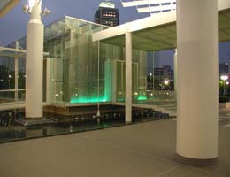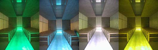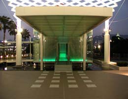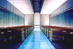 A wedding hall located adjacent to the port of Kobe, the Aqua Hall was illuminated by the Takenaka Corp. to enhance its glass double-skin structure, which stands suspended over a pool. At night, mists of water lighted by underwater fixtures, encircle the jewel-box-like building, whose glass screen walls are internally luminous and visible to passersby. The Hall's interior was designed to heighten the drama od a wedding. Its key element is a transparent glass floor that bisects the space and allows a view of the pool below. The bottom of the glass is covered with mesh optical fiber, which shifts through a palette of six colors for a variety of effects. The glass screen walls as well as the concrete ceiling are illuminated with fluorescent fixtures concealed at floor level, producing a clean look and enhancing the space's simple architectural lines.